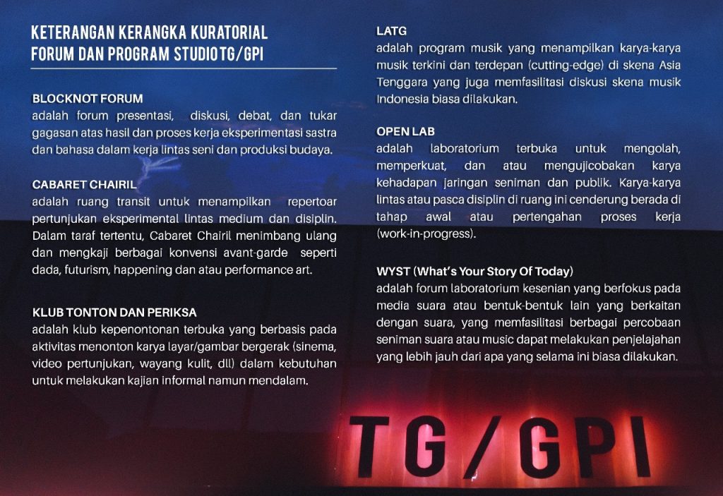 adalah laboratorium terbuka untuk mengolah, memperkuat, dan atau mengujicobakan karya ke hadapan jaringan seniman dan publik. Karya-karya lintas atau pasca disiplin di ruang ini cenderung berada di tahap awal atau pertengahan proses kerja (work-in-progress).