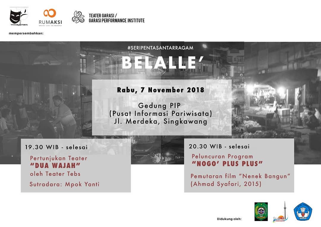 Teater Garasi/Garasi Performance Institute bekerja sama dengan Teater Tebs dan Rumaksi (Ruang Muda Kreatif Singkawang) menyelenggarakan: Seri Pentas AntarRagam BELALLE’ 7 November 2018 Gedung PIP (Pusat Informasi Pariwisata) Jl. Merdeka, Singkawang Pukul 19.30 Pertunjukan Teater “Dua Wajah” oleh Teater Tebs Sutradara: Mpok Yanti Pukul 20.30 Launching Program “NOGO’ PLUS PLUS Pemutaran Film “Nenek Bangun”(Ahmad Syafari, …