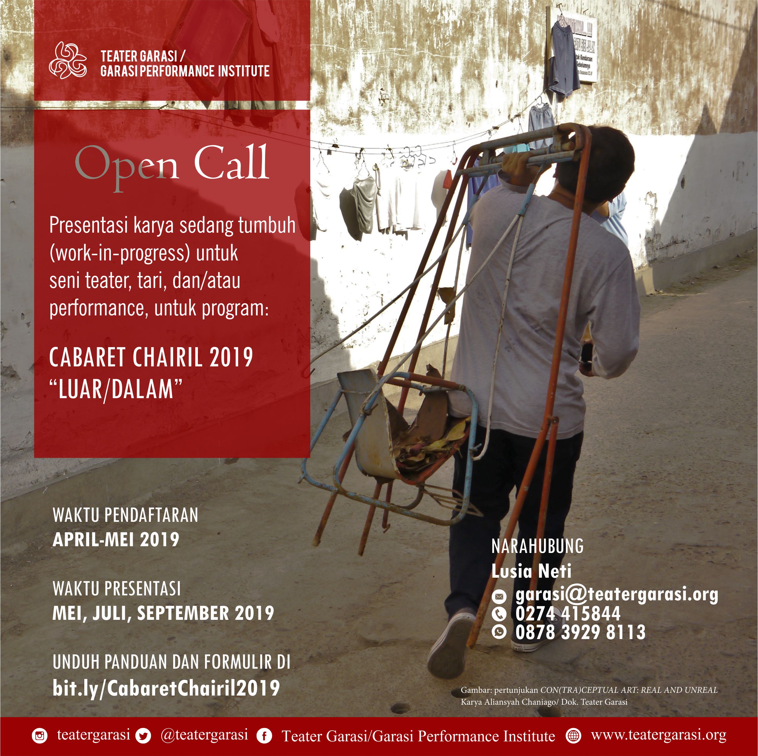 Teater Garasi/Garasi Performance Institute mengundang seniman teater/tari/performance untuk mempresentasikan karya sedang tumbuh (work-in-progress) dalam program Cabaret Chairil 2019 dengan tema “Luar/Dalam”.