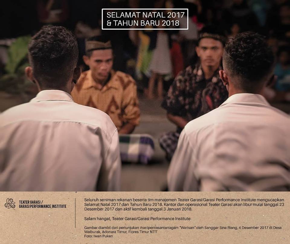 Seluruh seniman rekanan (artist associates) berserta tim manajemen Teater Garasi/Garasi Performance Institute mengucapkan Selamat Natal 2017 dan Tahun Baru 2018.